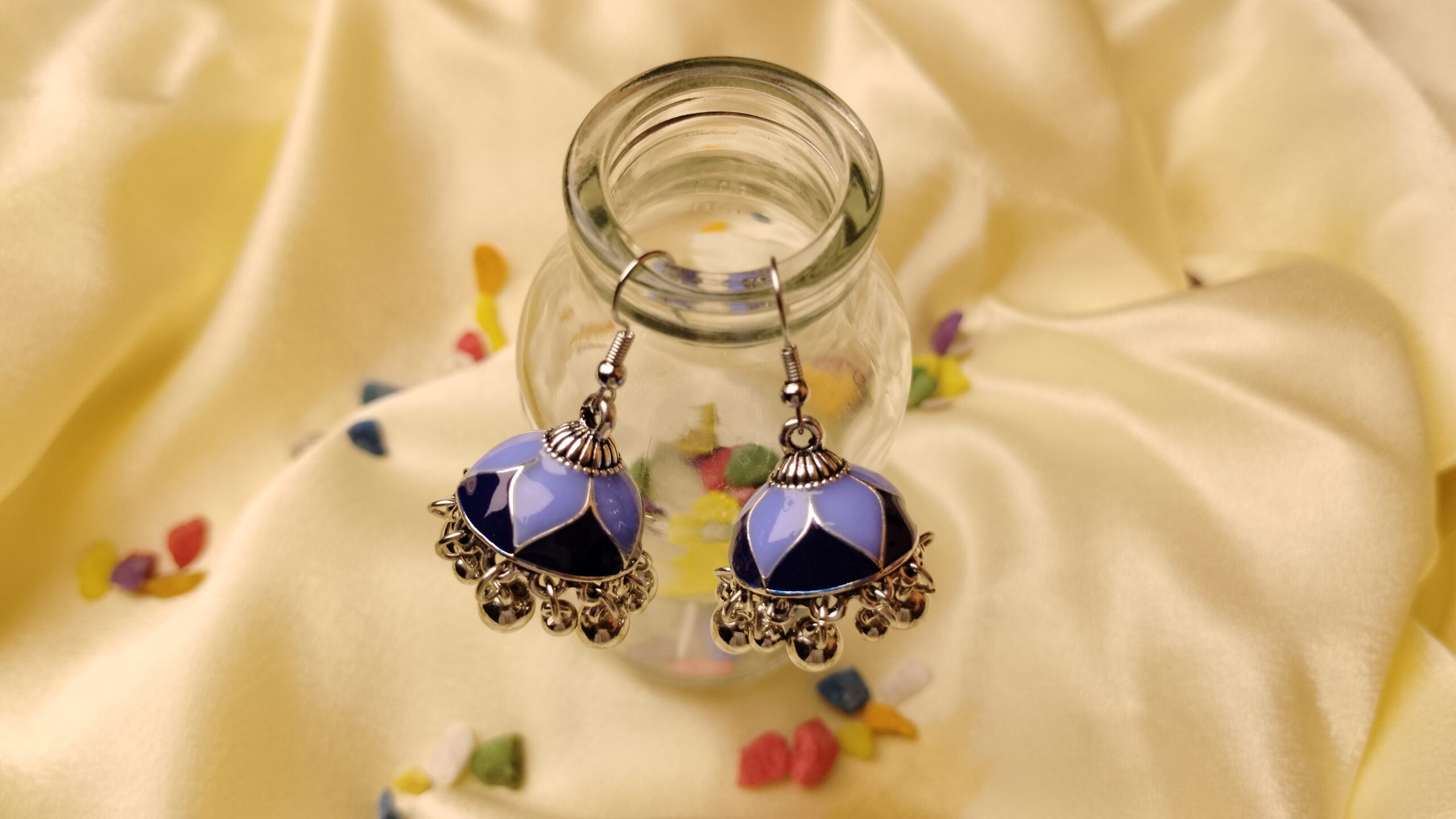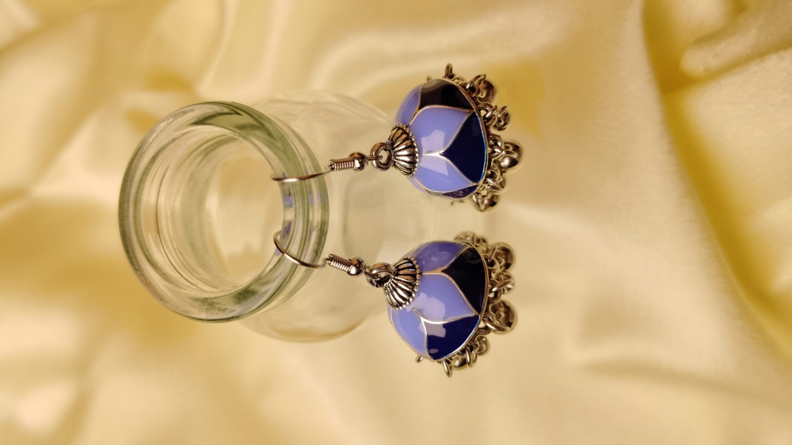 Royal blue jhumki earrings. Hypoallergenic stainless steel, traditional design with modern elegance, perfect for festive wear or gifting.